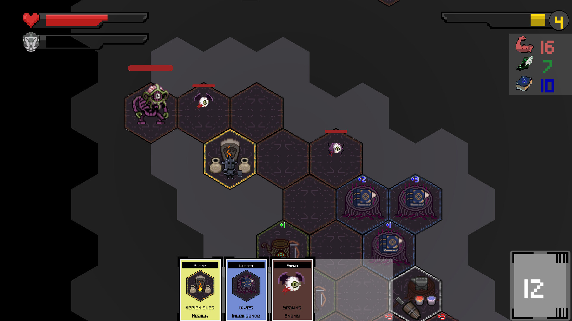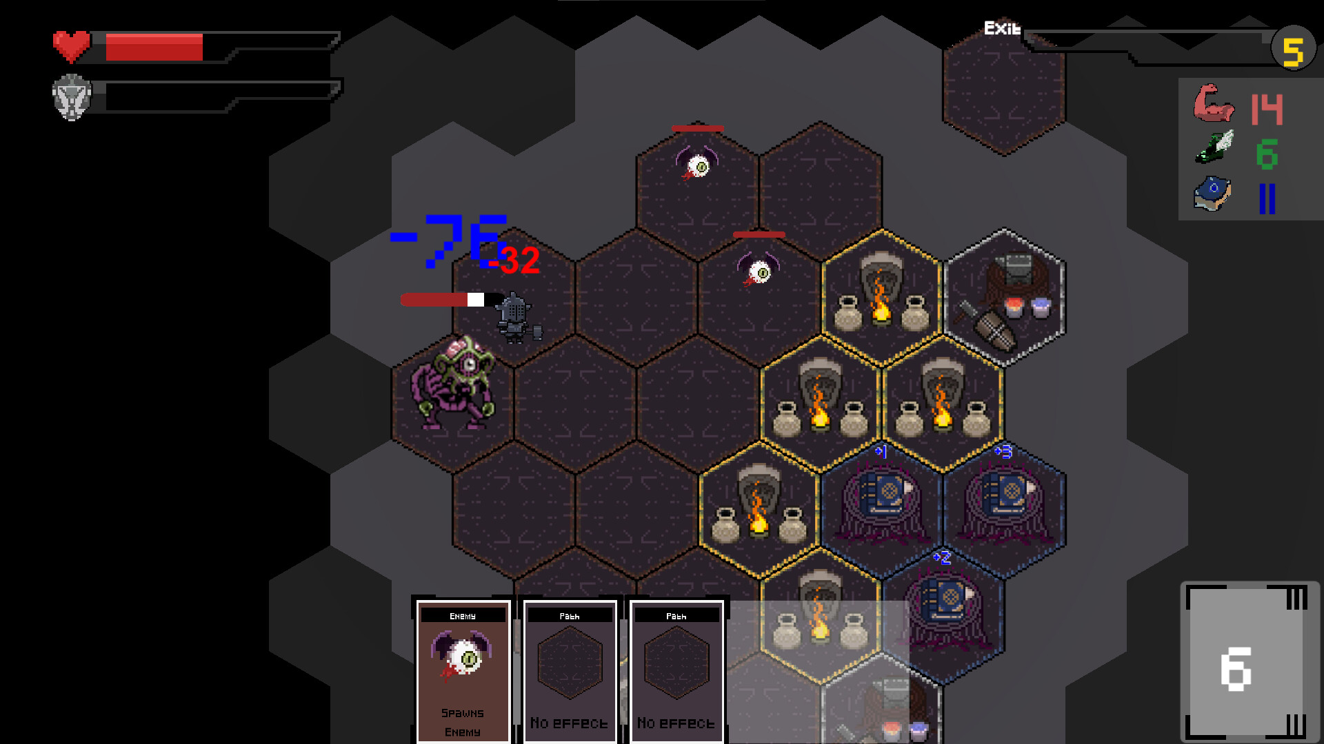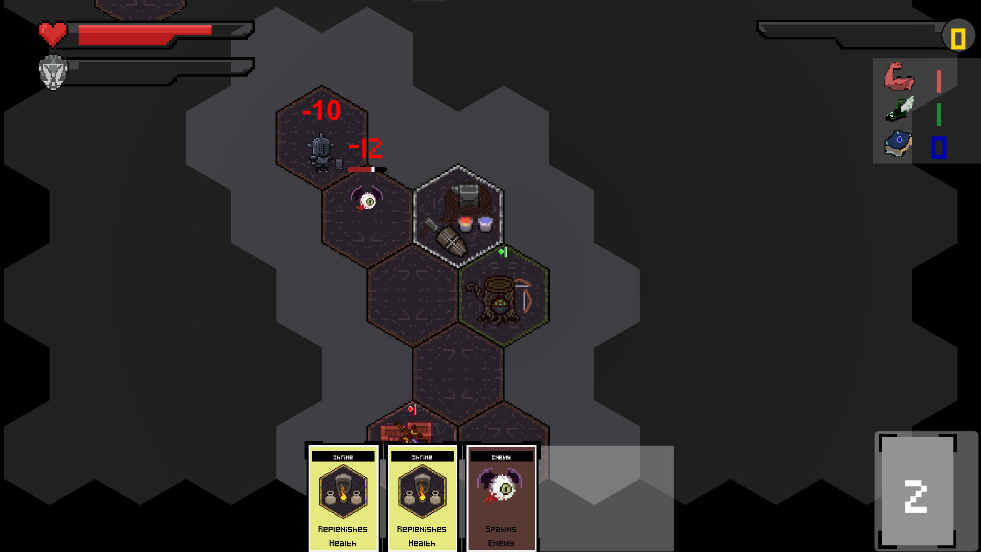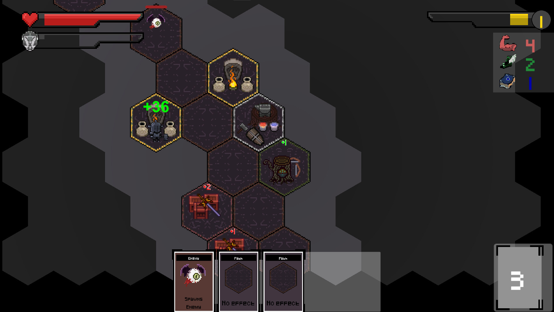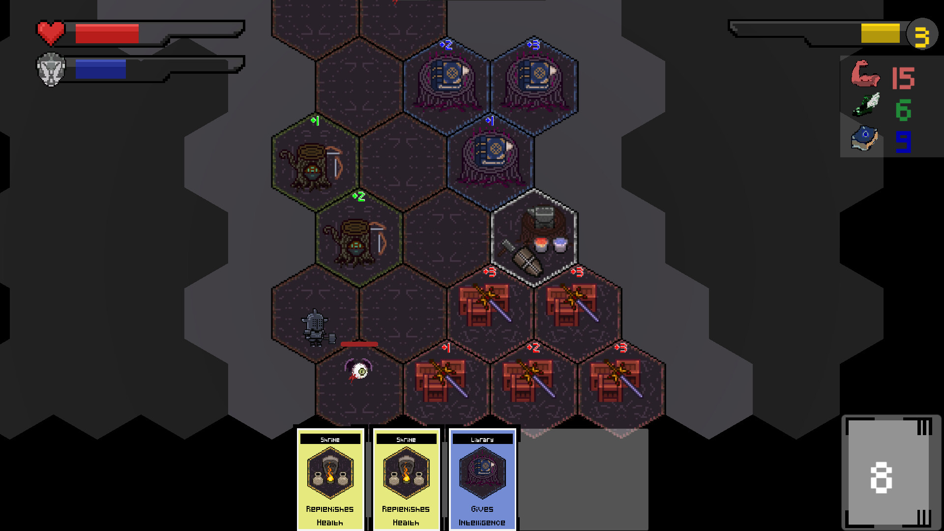 As the title suggests, in this game you play as a 'dungeon architect'. You build the dungeon by placing the cards from your hand onto empty tiles and have the little hero automatically move there. Different tiles have different effects on the hero, some increase his stats, others restore health. But beware! You don't have enough cards to get to the end. To get more, you have to defeat enemies. Furthermore, the key to the exit is guarded by a big monster.