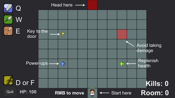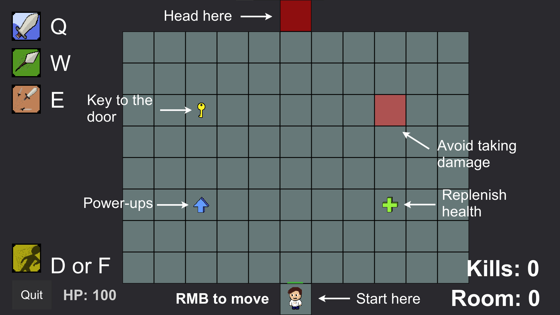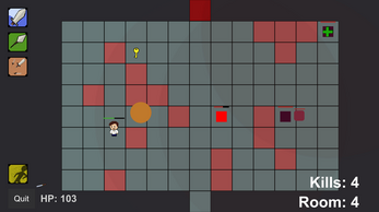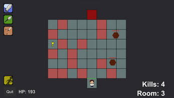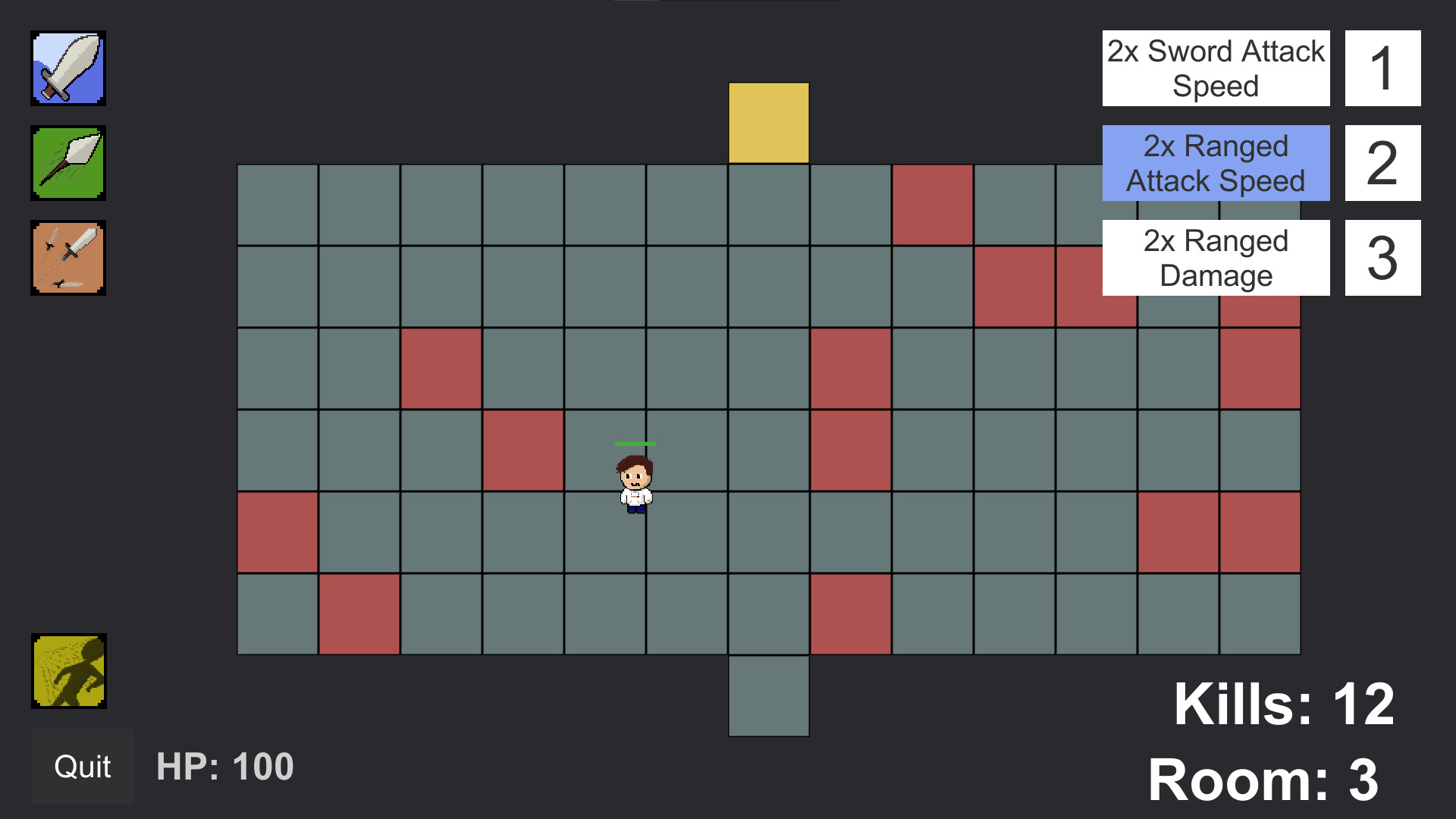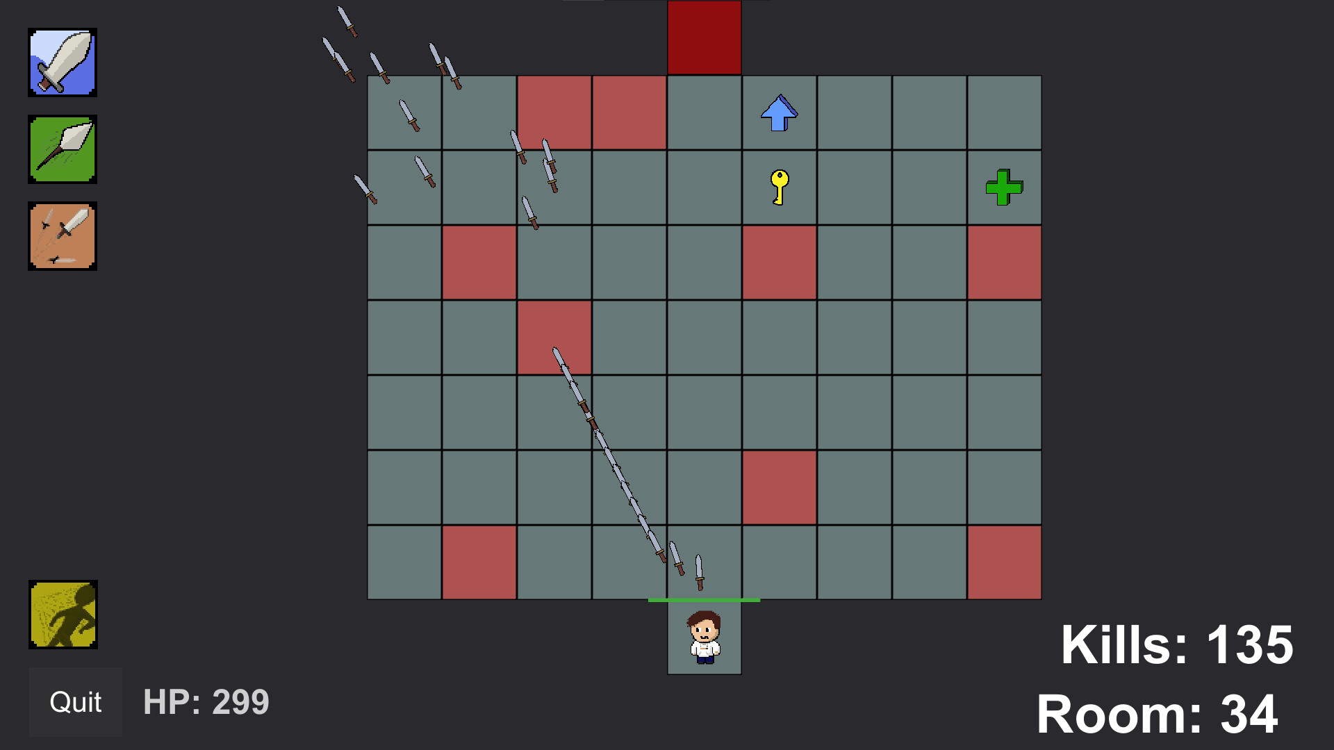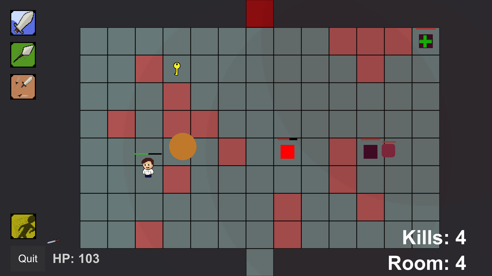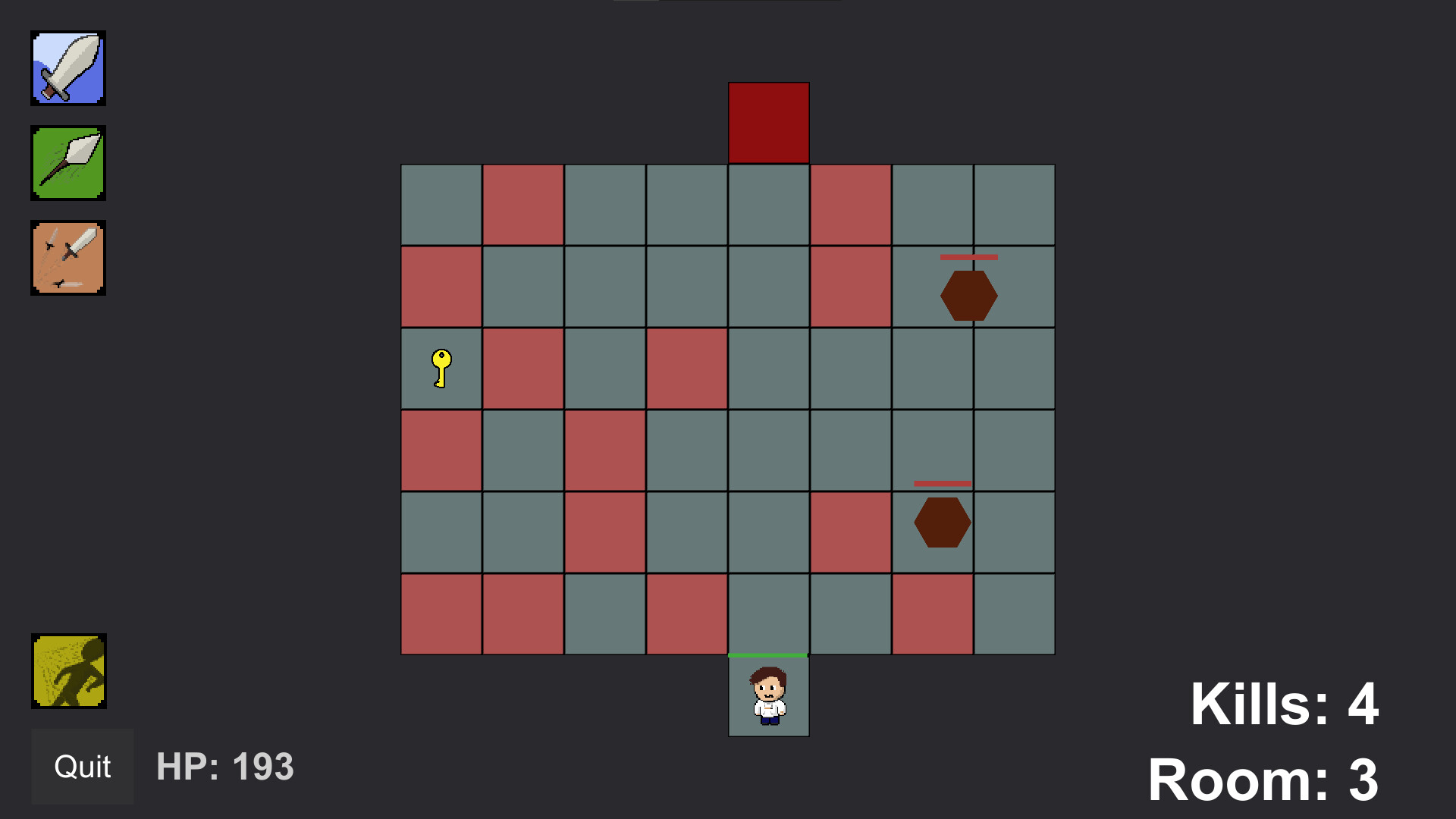 As to how it works, the game first generates a grid of squares, then populates those squares with tiles, traps or enemies, the number of which always depends on the size of the room. Then the player can use three different attacks (sword, spear or throwing daggers) to battle the enemies. Said enemies are also different and act differently with some basic AI in place. The 'totem' for example would throw bombs towards the player, predicting their movement. To hold it all together, I made some very crude assets to visualize the gameplay, but my focus went into coding rather than drawing.